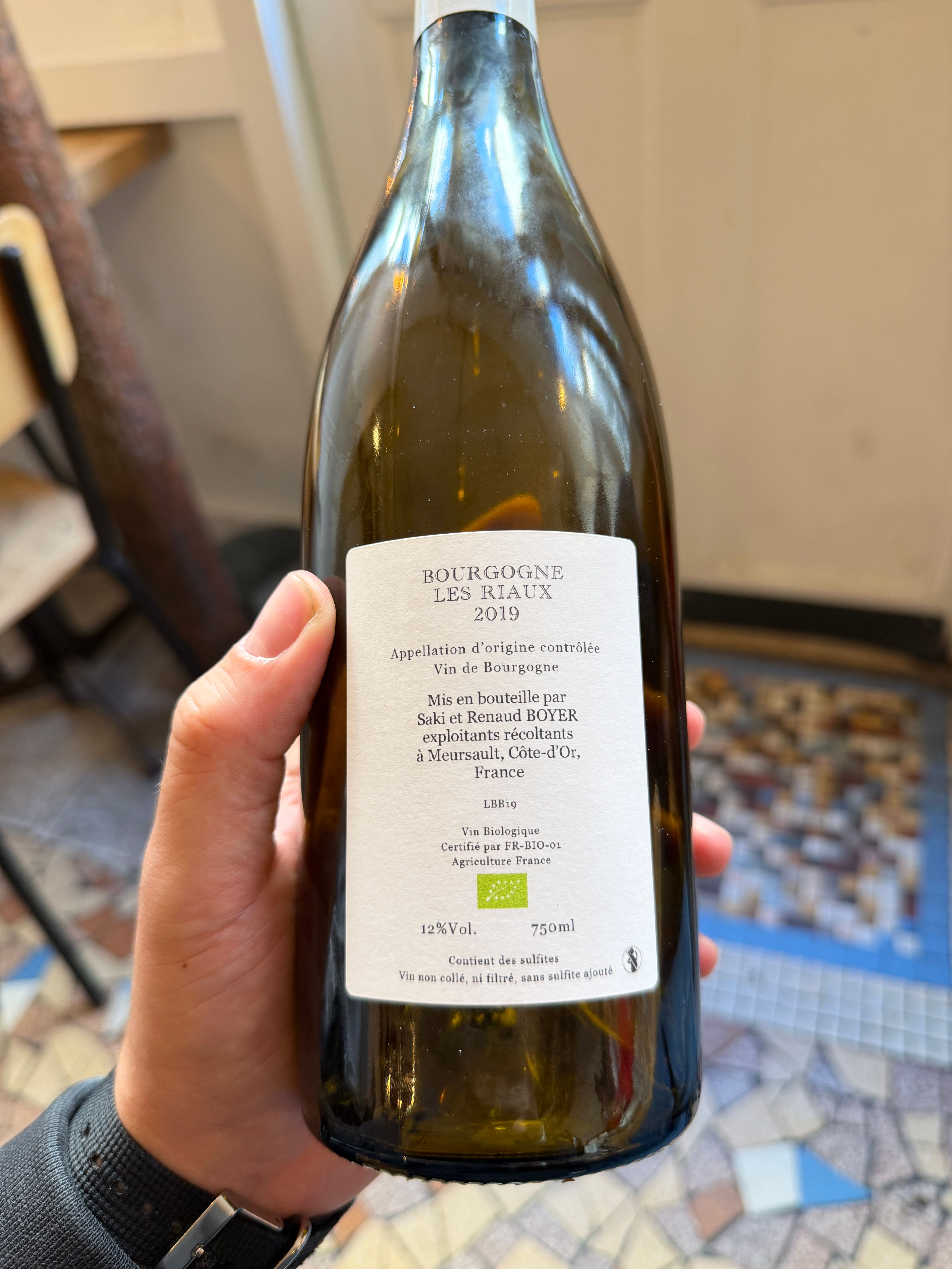 The way we ended up drinking this bottle is actually a pretty funny story. My friends Sophie and Hayden and I were sitting down at Mokonuts for our first meal back in Paris after the Loire Valley fairs. We were excited, but also trying to pace ourselves financially after the weekend we’d just had, and the week ahead in Paris. So naturally, we asked Moko, the owner, to help us pick something in a lower price range, and she suggested Renaud Boyer’s Bourgogne Blanc “Les Riaux” 2023. It was right where we wanted to be price-wise, and we were already familiar with his wines, so we happily said yes.